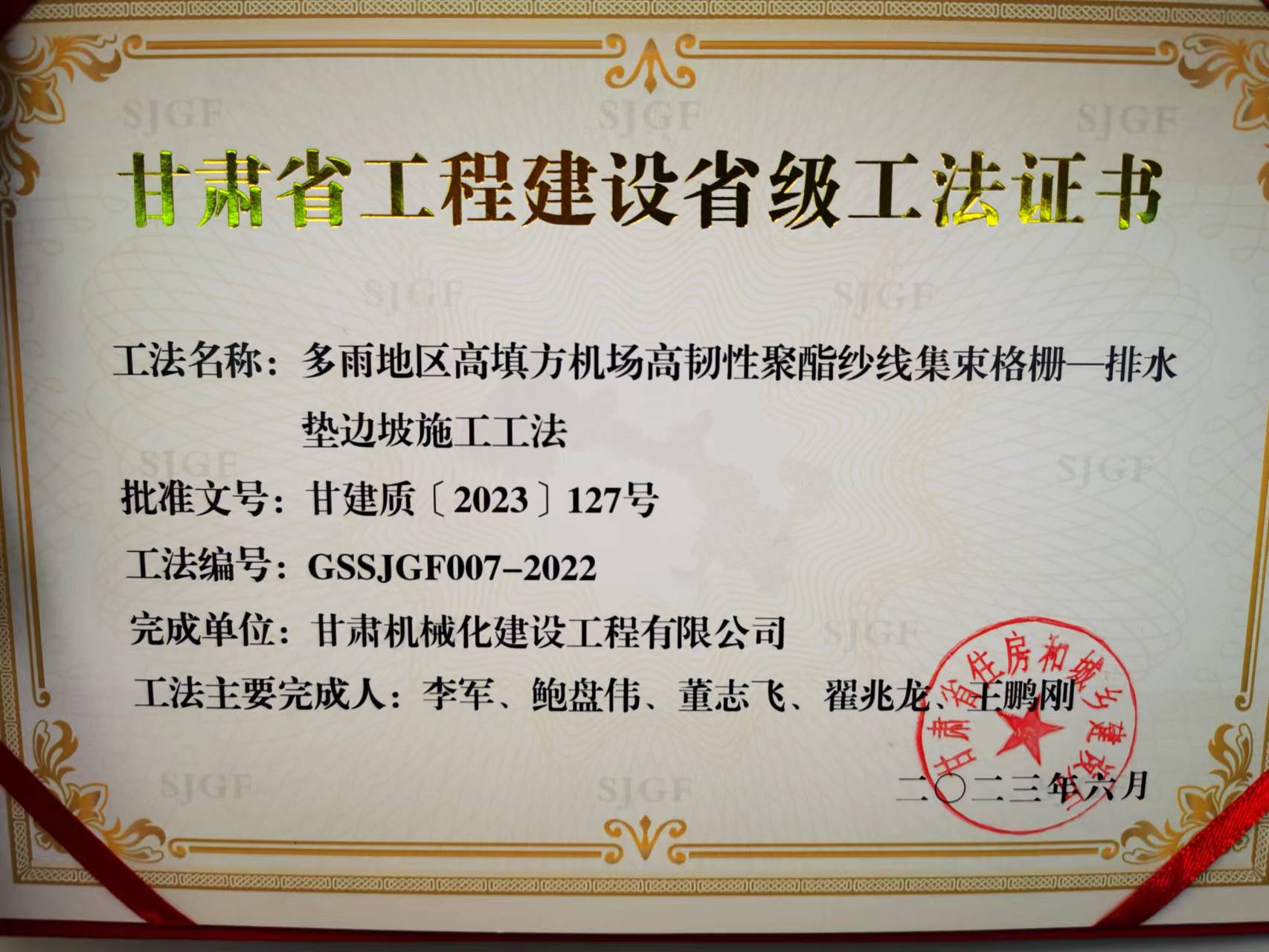 近年來(lái),我司不斷加強技術(shù)創(chuàng )新和精品工程創(chuàng )建,科技創(chuàng )新能力和工藝水平再上新臺階。在承建的麗水機場(chǎng)土石方工程02標段中,面對多雨地區高填方施工中的重難點(diǎn),公司專(zhuān)門(mén)組建了科研和施工小組,通過(guò)大量現場(chǎng)工藝實(shí)踐、工藝改善,提煉出項目重難點(diǎn)的關(guān)鍵技術(shù)。2023年6月,獲得了“多雨地區高填方機場(chǎng)高韌性聚酯紗線(xiàn)集束格柵—排水墊邊坡施工工法”。