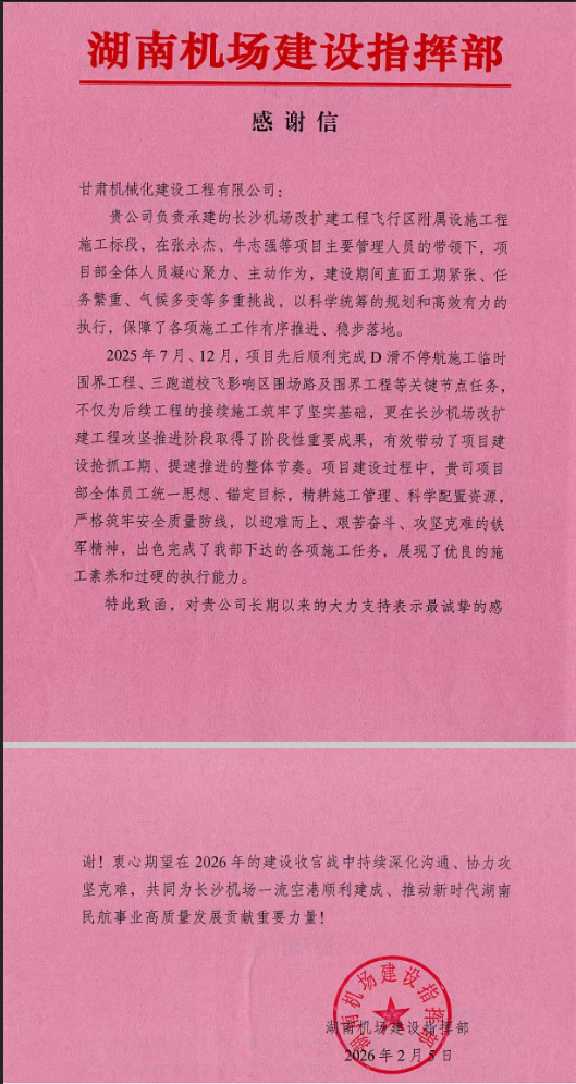 近日,我司接連收到甘肅省民航機(jī)場(chǎng)集團(tuán)、湖南機(jī)場(chǎng)建設(shè)指揮部發(fā)來(lái)的感謝信,對(duì)我司在蘭州中川國(guó)際機(jī)場(chǎng)三期擴(kuò)建工程、長(zhǎng)沙機(jī)場(chǎng)改擴(kuò)建工程中的突出表現(xiàn)給予高度評(píng)價(jià)與誠(chéng)摯感謝。